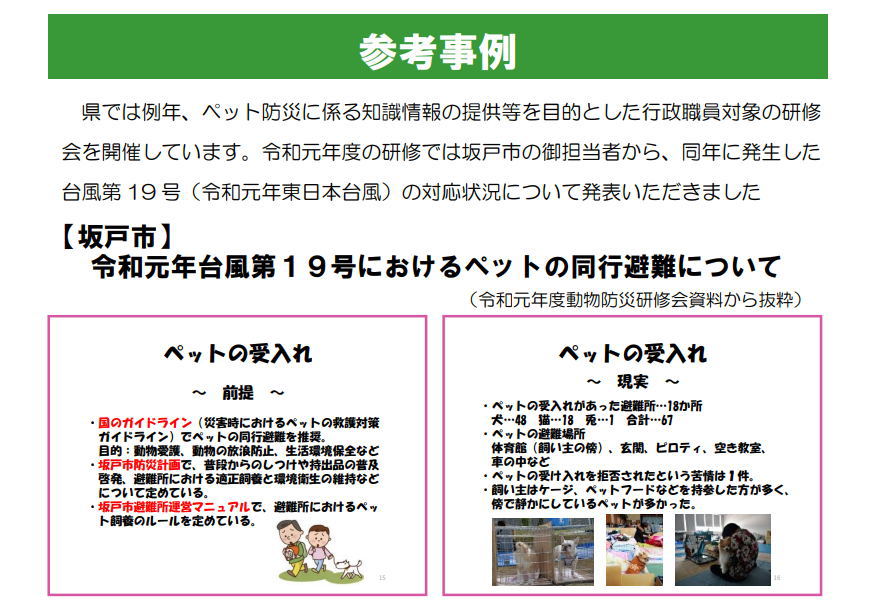 令和元年10月12日台風19号が坂戸を襲いました。レベル4の勧告が出て大多数の坂戸市民が避難しました。のら猫のことも心配でしたが、ペットの同行、同伴避難ができているのか、平成28年3月改訂、坂戸市地域防災計画に記載の通りのことができているの...